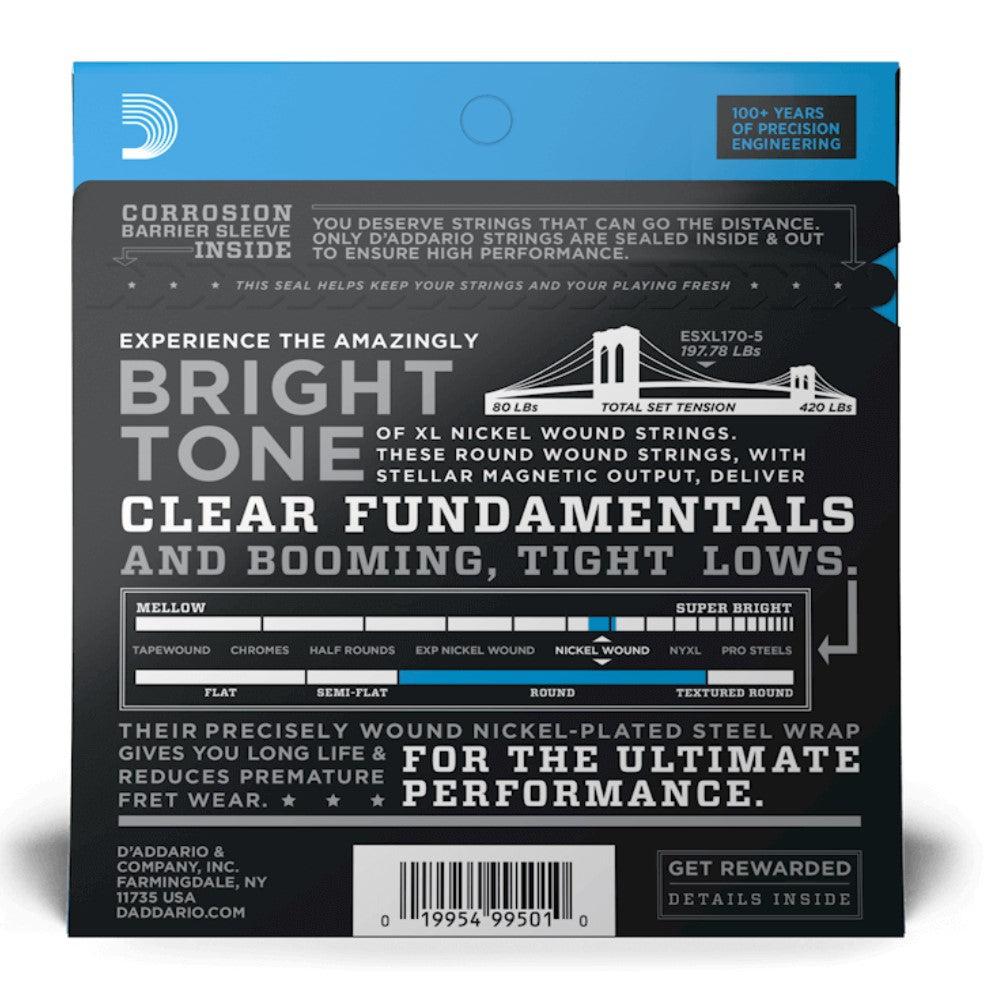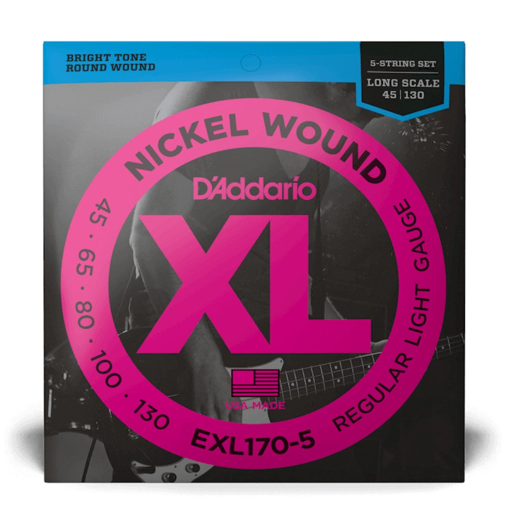 XL Nickel are the industry standard in electric bass strings. With their clear fundamentals, booming tight lows, and reliable D’Addario construction, they’re trusted by players everywhere to handle any performance. XL Nickel bass strings are made with a high carbon steel core and wound with nickel-plated steel wrap wire, for consistently bright tone and smooth playability, great for a wide variety of bass styles. Made for 5-string basses, 45-130 Regular Light gauge strings takes our most popular bass gauge and adds a low B-string.