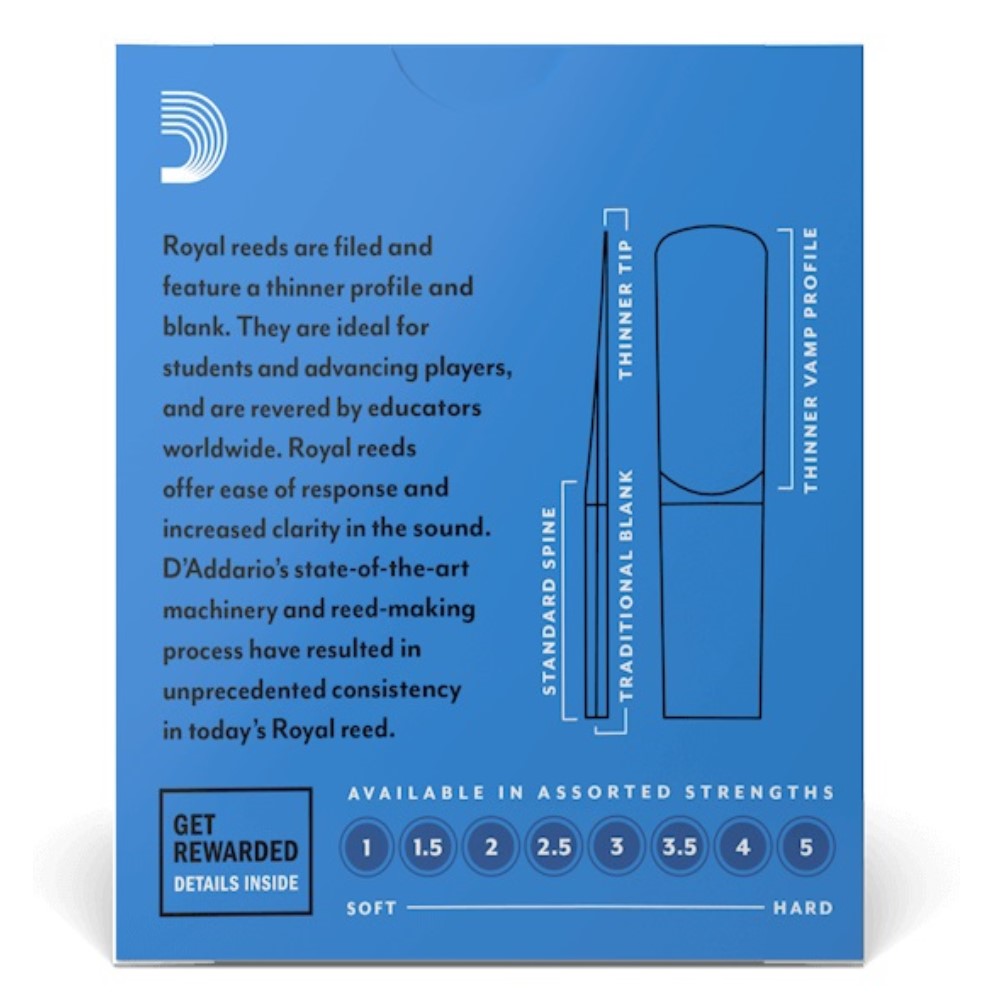 Featuring a filed cut for additional tonal clarity, Royal by D’Addario Alto Saxophone reeds are ideal for both beginning and advancing players. These reeds have a traditional blank and profile to give you an ease of response when playing