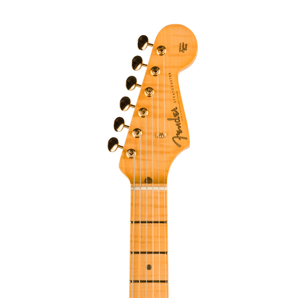 The one-piece 4A flame maple neck has a big, comfortable 10/’56 Soft “V” profile, topped by a 9.5”-radius fingerboard with 21 gold Medium Vintage (47095) frets, abalone dot markers and a bone nut. Pure sonic Strat® magic comes from three Custom Shop hand-wound Fat ’50s Stratocaster® pickups with gold magnets, delivering crisp highs and well-balanced mids and lows. Vintage Modified #2 wiring includes five-way pickup switching and the Tone-Saver bleed circuit, which eliminates tone loss when volume is turned down.