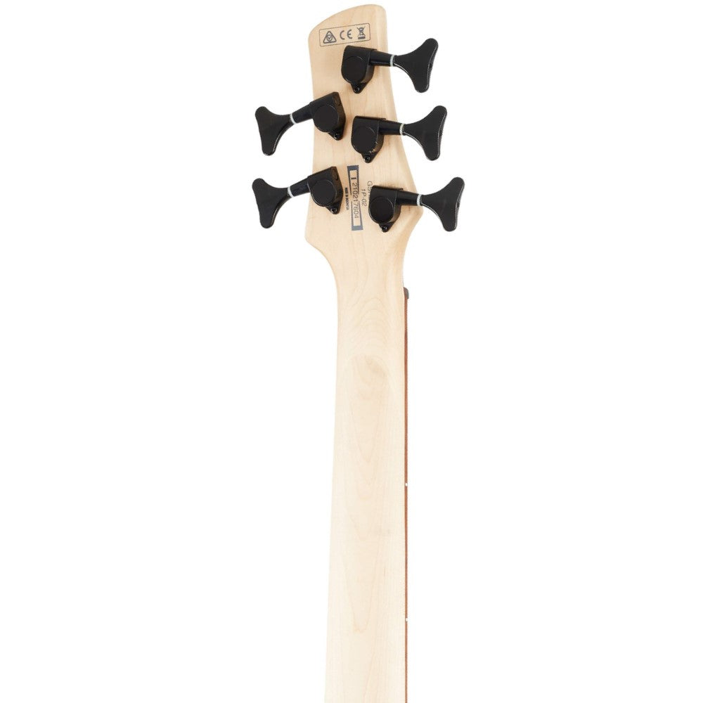 The GSR205B features a double-cutaway mahogany body bolted to a maple neck with a 24-fret rosewood fingerboard with white dot position markers. Components include a pair of Ibanez Dynamix passive pickups with a Phat II equalizer, a B15 bridge with 16.5mm string spacing, a plastic nut and Ibanez tuning machines.