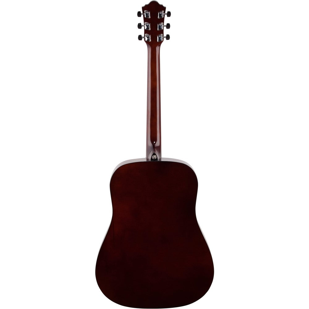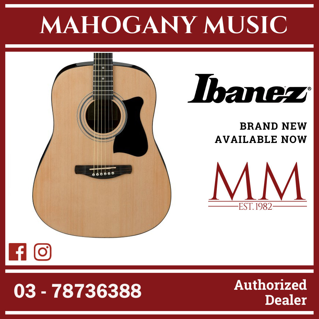 The V50 features a dreadnought body with a laminated spruce top on agathis back and sides. The round soundhole has a black and white decal rosette and a black pickguard. The mahogany neck has a 20-fret rosewood fingerboard with white dot position markers. Components include a compensated Ivorex II saddle in a rosewood bridge with ivory Ibanez Advantage bridge pins, an Ivorex II nut, a black pickguard, and chrome Ibanez covered tuning machines.