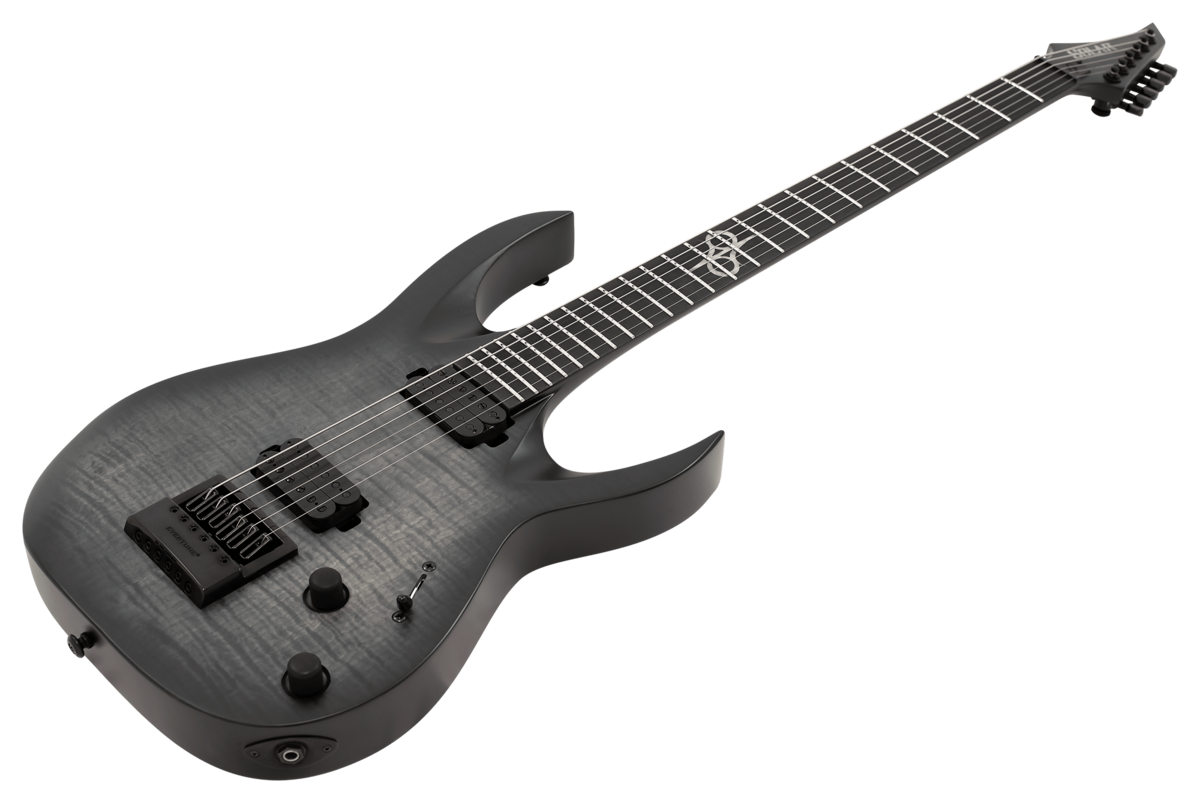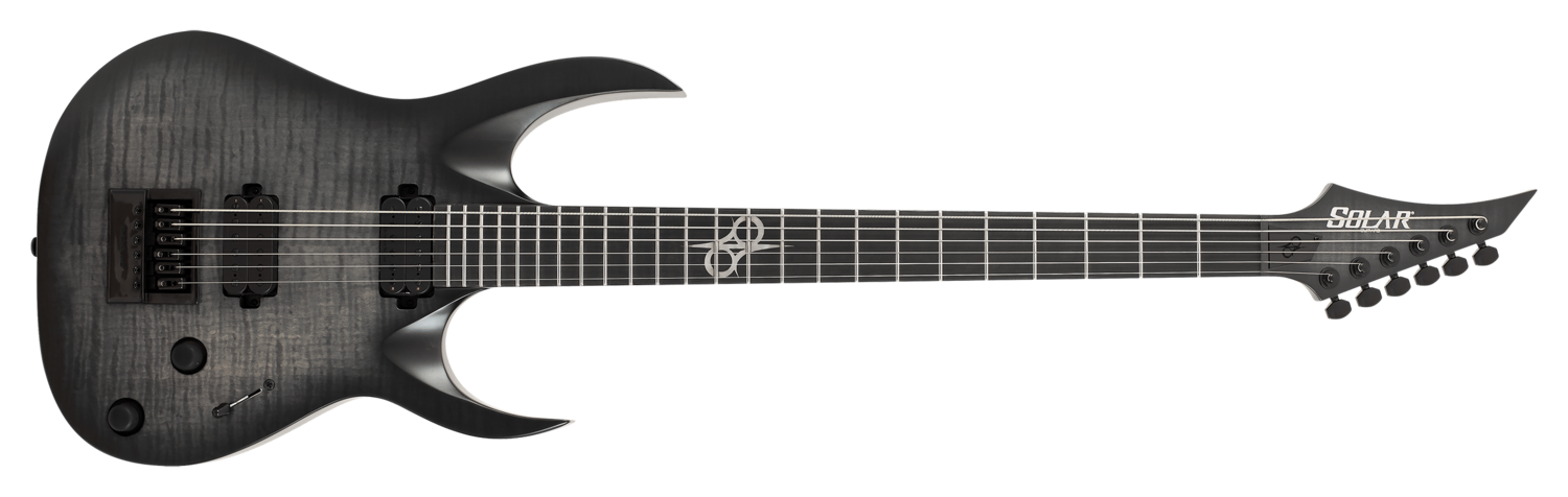 Loaded with Solar 18:1 locking tuners, PPS nut, five-way blade pickup switching and full access neck. Available in flame black matte finish.