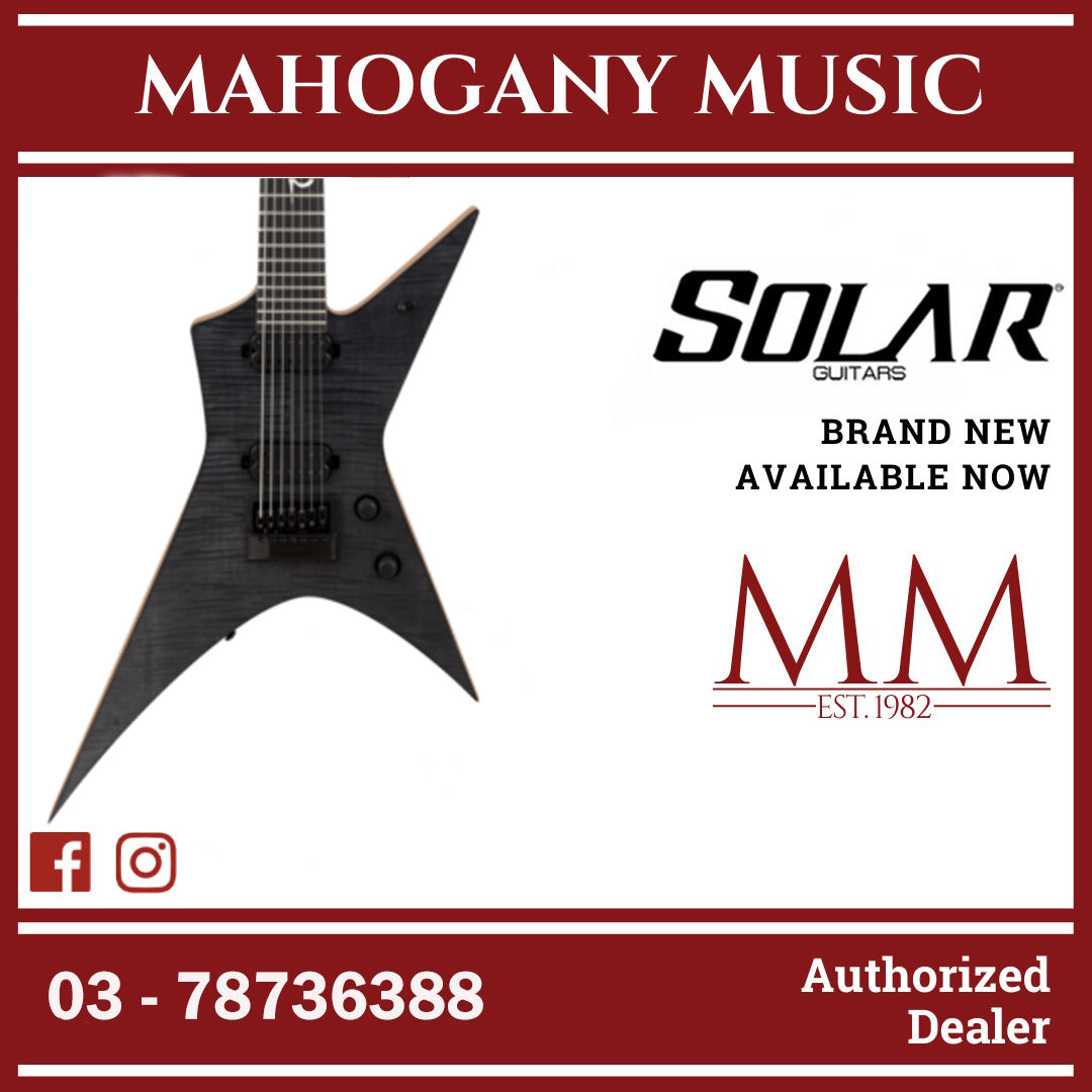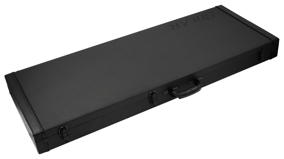 Loaded with Solar 18:1 locking tuners, PPS nut, 3-way toggle pickup switching with push-pull for tap coil and full access neck. Available in flame black matte with black hardware, it also includes a Solar custom fitted wooden hardcase.