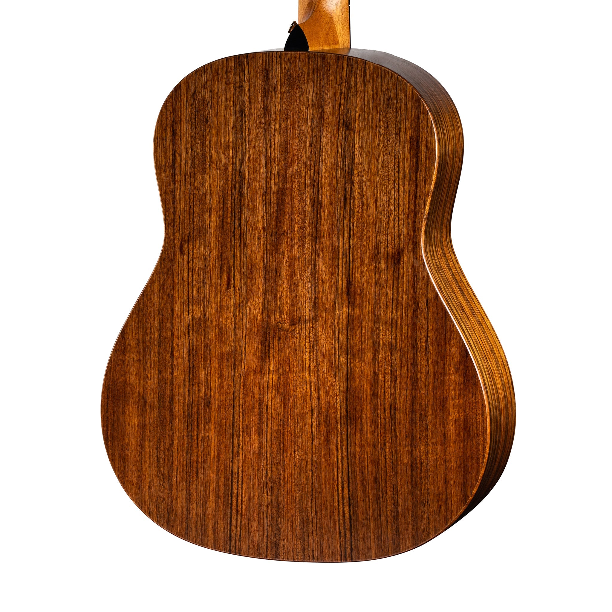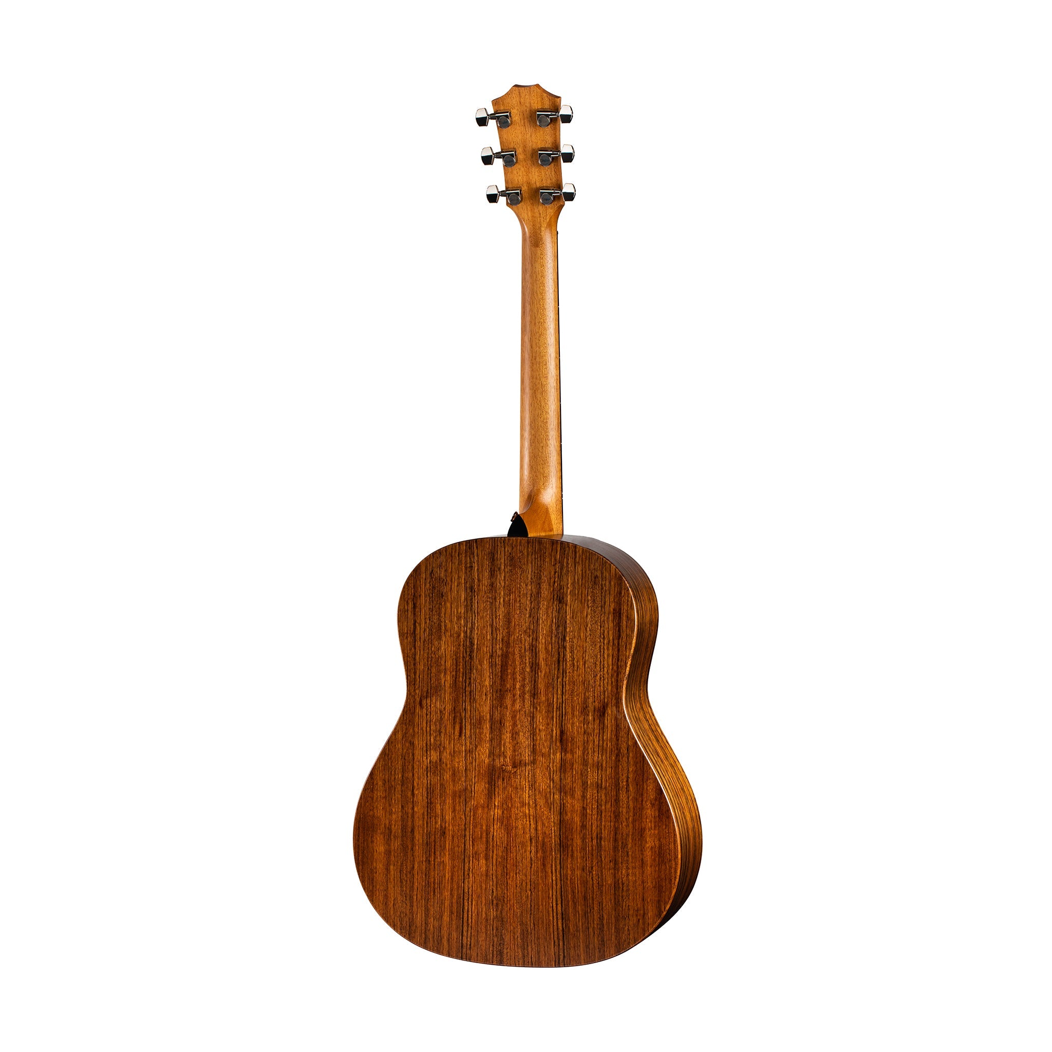 This Grand Pacific model is the first of our round-shoulder dreadnoughts to feature back and sides of solid ovangkol, an African tonewood that shares rosewood’s warmth and brilliance with additional presence in the midrange. Topped with solid spruce, the AD17 serves up a blend of sparkle and clean low-end power, enhanced by V-Class bracing for greater volume, longer sustain, and a more in-tune sound. That seasoned, vintage-hued tone is reflected in this model’s strikingly classic look, with a natural top and a deep Urban Sienna colour treatment for the ovangkol back and sides. Minimally decorated but finely crafted, the AD17 also features chamfered body edges, stained spruce edge trim, a three-ring rosette in Hawaiian koa, and a faux tortoiseshell pickguard. The 2.0 mil-thick matte body finish minimizes damping for unfettered resonance. It ships in a Taylor AeroCase.