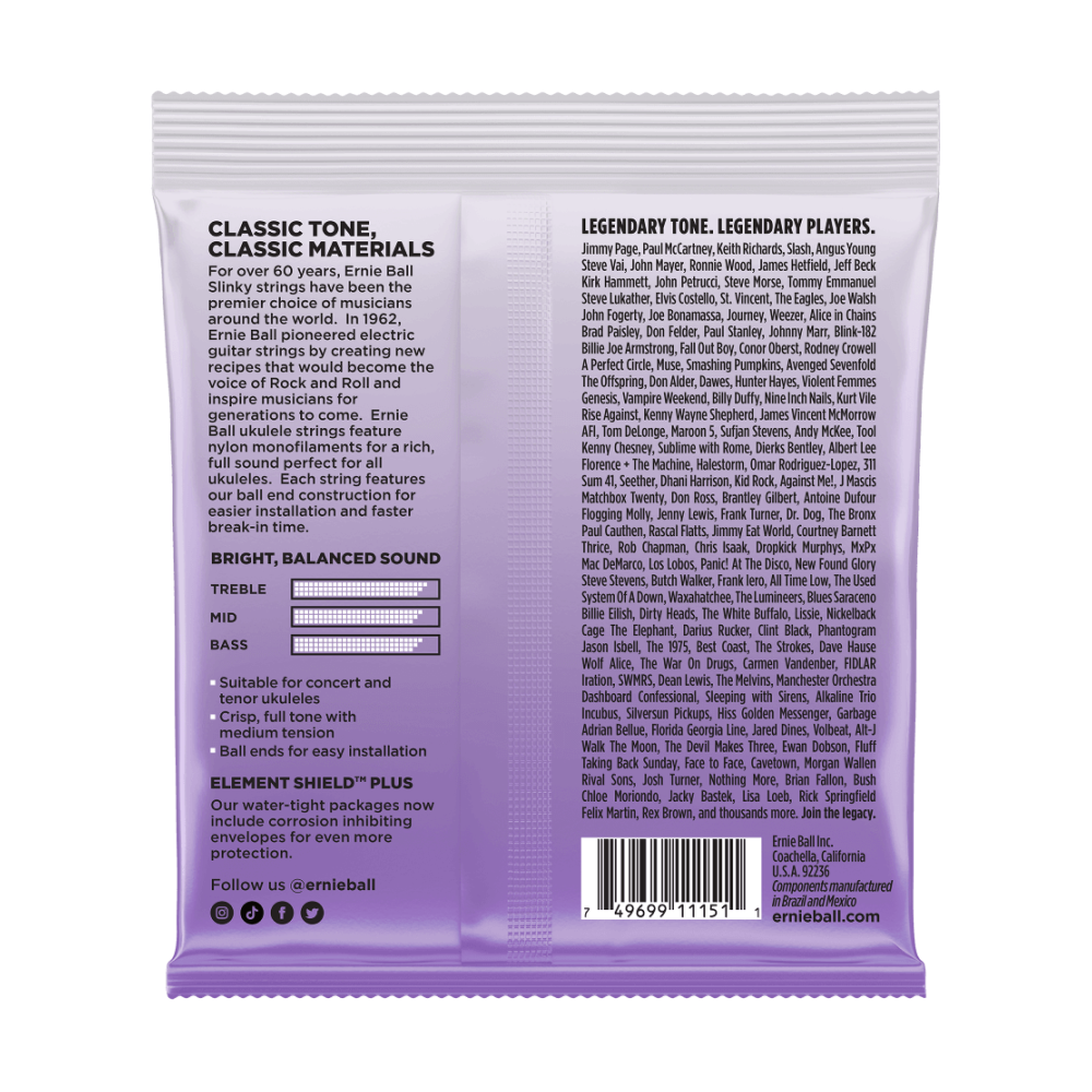 Ernie Ball is proud to announce two new ball-end ukulele sets featuring a .030” gauge wound low G string. This new gauge combination is ideal for players who want to tune their ukulele using “Low G” tuning, which is more similar to traditional guitar tuning. These new Ukulele strings are made from 100% nylon monofilament, while the wound G string is made from nylon multifilament wrapped with 80/20 bronze. Ernie Ball Ukulele strings feature ball end construction for easy installation in traditional clear resin for a bright, balanced tone with excellent projection and black resin for a warm, rich tone with percussive attack