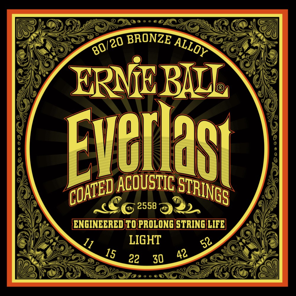 Ernie Ball Everlast Coated acoustic guitar strings use groundbreaking nanotechnology that repels unwanted moisture and oils that negatively impact your tone. Our proprietary treatment is applied to both the inner hex core and outer wrap wire to provide ultimate protection without compromising tone or feel. Made from 80% copper, 20% zinc wire wrapped around hex shaped brass plated steel core wire providing a crisp, ringing sound with pleasing overtones. Gauges .011, .015, .022, .030, .042, .052