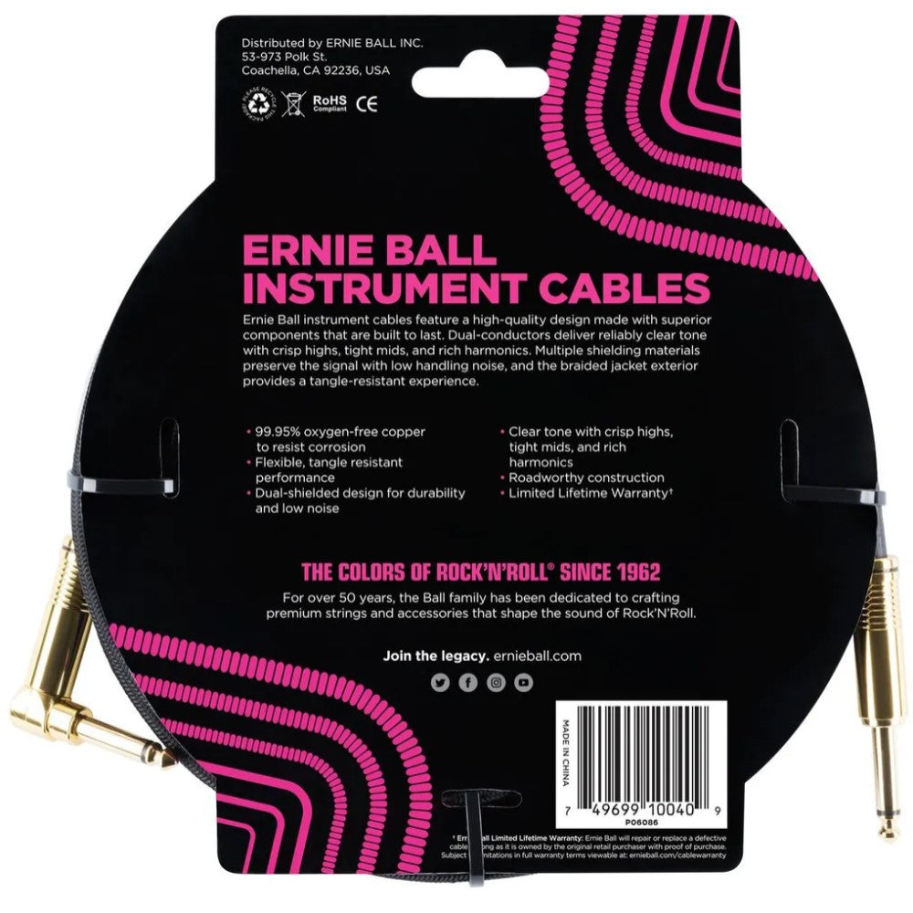 Ernie Ball instrument cables feature a high-quality design made with superior components that are built to last. Dual-conductors deliver reliably clear tone with crisp highs, tight mids, and rich harmonics. Multiple shielding materials preserve the signal with low handling noise, and the braided jacket exterior provides a tangle-resistant experience. Cable length 18ft (5.49m).
