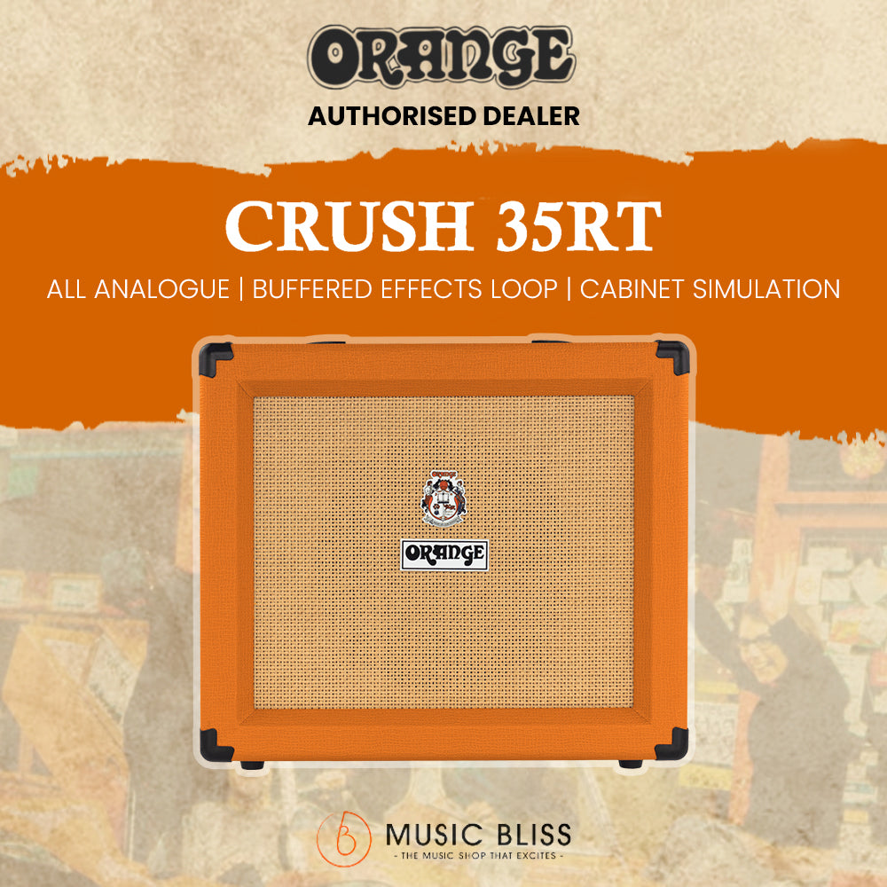 The fully-loaded Orange Crush 35RT brings you gut-punching tones with highly responsive overdrive and mind-blowing levels of detailed saturation. Featuring two foot switchable channels, the Crush 35RT's 4-stage pre amp provides you with enormous, wide-ranging tones that will take you back to the heady days of no-nonsense, old school analog guitar amplifiers. You also get Orange's innovative CabSim circuit that faithfully emulates the muscle of an Orange 4 x 12" cabinet through the Crush 35RT's headphone/line output, as well as an on board tuner and reverb. All that and a fully buffered low-impedance effects loop! The guitarists here at Music Bliss are huge fans of Orange guitar amplifiers, and we're really stoked about the value-priced Crush 35RT combo!
