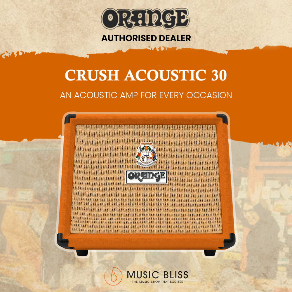 Orange's iconic amps and cabs have been the literal heartbeat of modern music, from Woodstock to Ozzfest. So imagine our delight at the announcement of the Crush Acoustic 30 a 30-watt portable acoustic amp with that familiar Orange style and flavor which can run off batteries or wall power. Its two channels instrument and vocal, or dual guitars sound lush and balanced through its tilt-back birch ply cabinet and specially voiced 8" World speaker. The Orange Crush Acoustic 30 also includes an effects loop for choosy stomp and pre amp integration, an 1/8" auxiliary input for jamming along to backing tracks, and pre- and post-EQ outputs for routing signals to a mixing board or interface. If you're looking for an acoustic amp that has the tones and visuals to take your practices and performances to breathtaking new heights, consider the Orange Crush Acoustic 30 from Music Bliss.