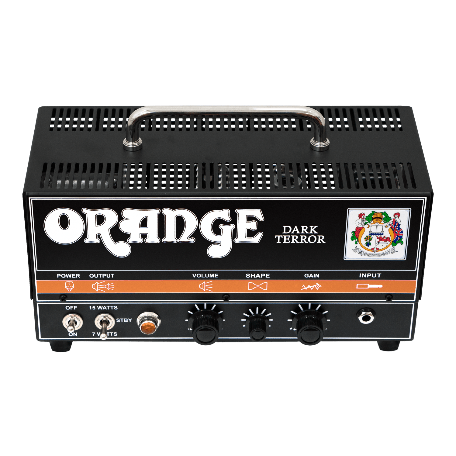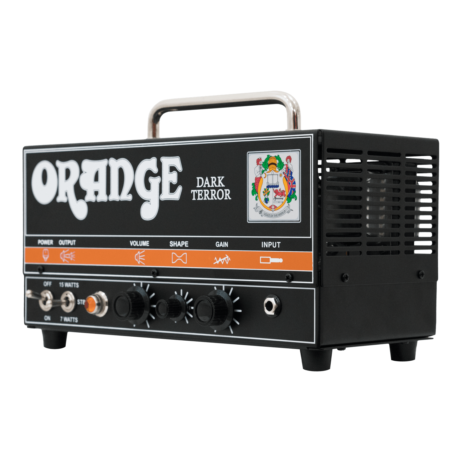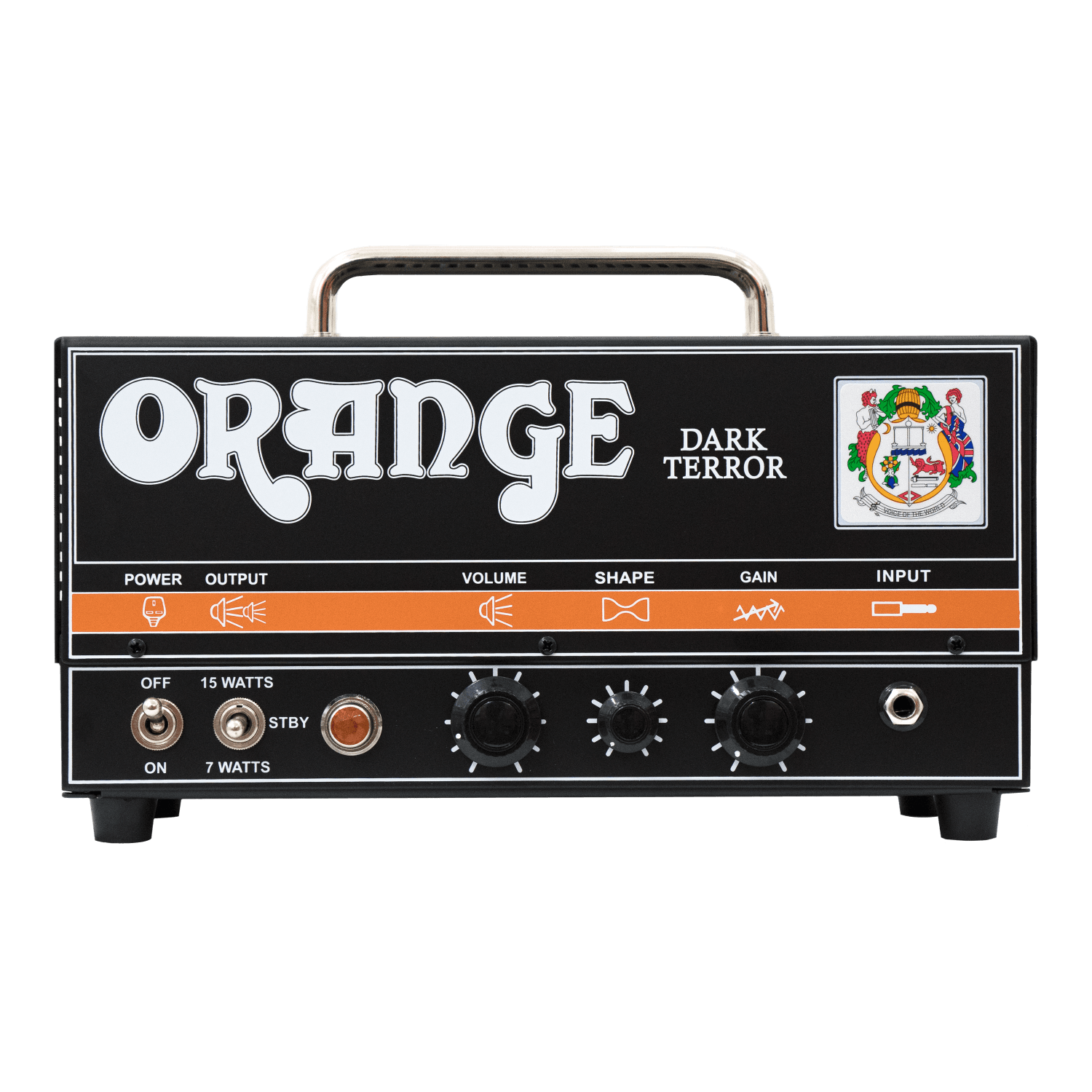 Plug into Orange's Dark Terror tube amp head and hang on. This amazing little amp pumps out up to 15 watts of incredible tones and excels at heavy, high-gain sounds. Plenty powerful for small gigs and rehearsals, the Dark Terror head also adapts well to studio use, as you can drop the wattage down to seven watts for lower-volume saturation. Dial in an awesome gain range. Use the shape knob to tweak your tones to your liking. You even get a very cool tube-driven effects loop, so you can add your own effects and get even more killer tones out of this compact head. Crank up the volume knob and behold the sonic beast that is the Dark Terror!