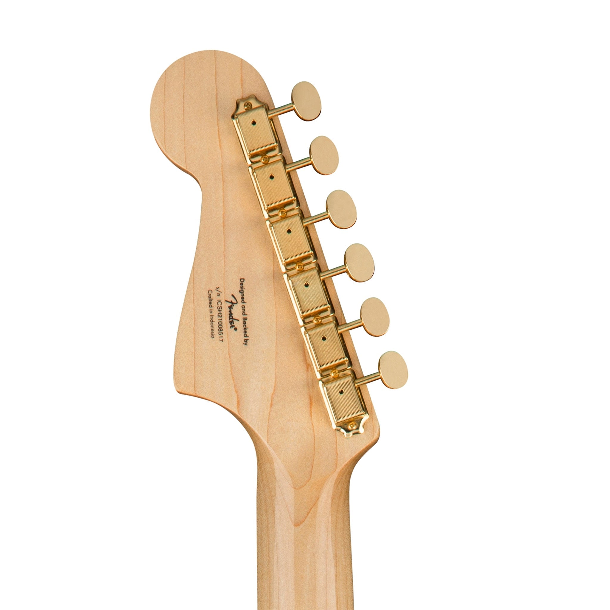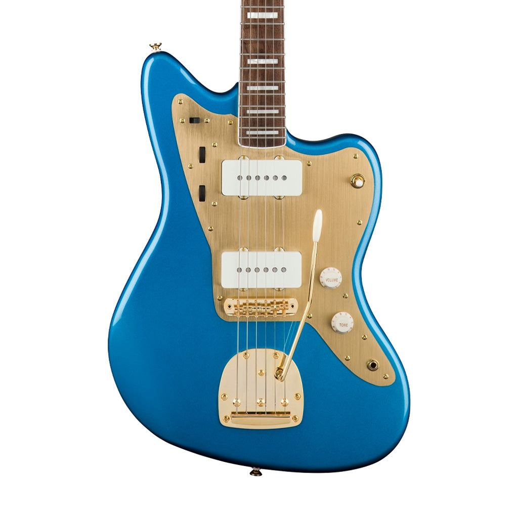 The Squier® 40th Anniversary Jazzmaster®, Gold Edition is a stylish model adorned with an eye-catching collection of upscale features for the discerning Squier fanatic. Featuring striking gold-plated hardware, a gold anodized aluminium pickguard, a bound Indian laurel fingerboard with Pearloid block inlays, an engraved anniversary neck plate and gloss finish throughout, this Jazzmaster is poised and ready for the spotlight. Player-friendly refinements of this commemorative model include a slim and comfortable “C”-shaped neck profile for an easy playing feel, vintage-style tuning machines and a 6-saddle floating bridge and tremolo for authentic performance and style, and Fender-Designed single-coil pickups with alnico 5 magnets for familiar Jazzmaster tone.